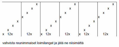 Ryhmään tuli 12 x 4 lankaa eli 48 lankaa (ryhmän leveys: 48 lankaa : 8 lankaa/cm = 6 cm). Ryhmiä oli kuusi, joten loimen lankaluvuksi muodostui 6 x 48 lankaa = 288 lankaa + 2 lankaa reunojen vahvistukseksi => 290 lankaa. (Loimen leveys: 6 x 6 cm = 36 cm tai 288 lankaa : 8 lankaa/cm = 36 cm.)