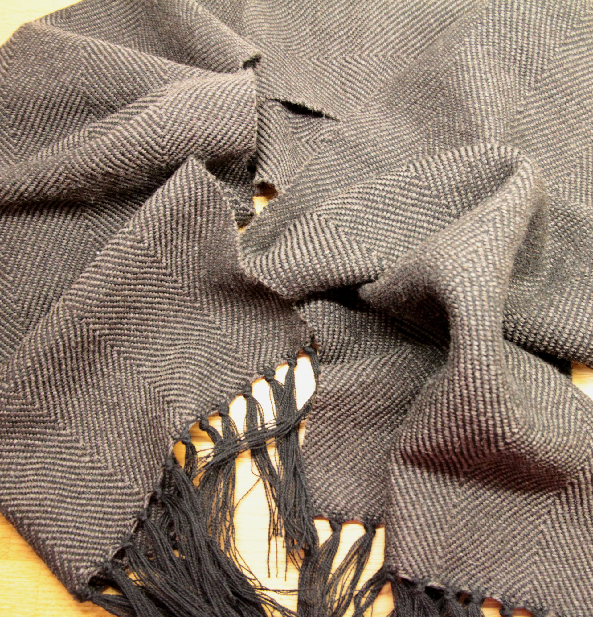 Tein huiviin hevosenhäntäsolmut, joihin otin loimilankoja kahden senttimetrin matkalta eli yhteensä 16 lankaa. Pesin huivin ilman pesuainetta villaohjelmalla ja tasokuivasin sen. Höyrytin hieman kuivahtaneen huivin kostean harson läpi höyrysilitysraudalla raudan korkeimmalla lämpötilalla. Harjasin huivin pitkittäissuuntaisin liikkein napakalla keinokuituharjalla.