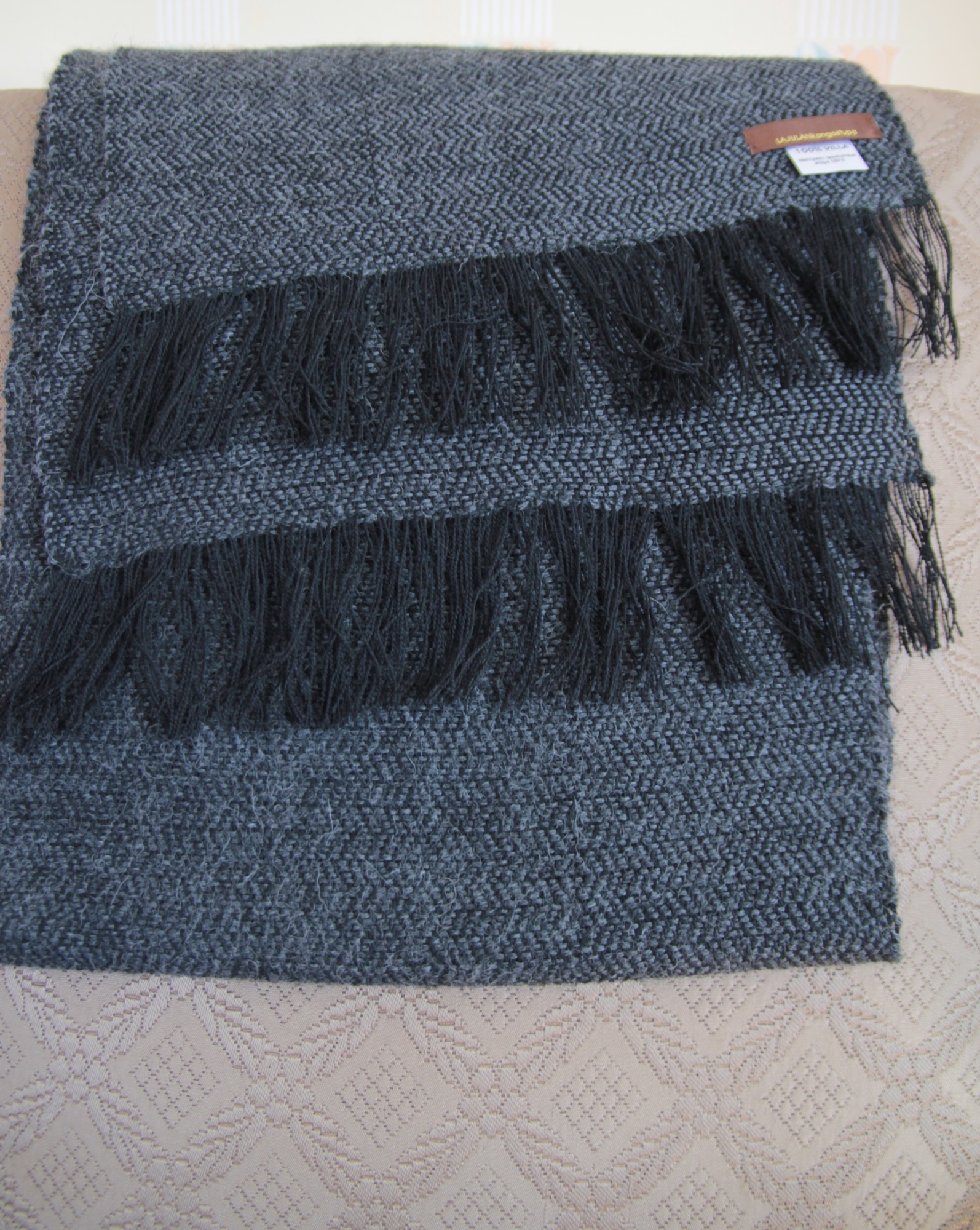 Ompelin ompelukoneella kapean, 1-2 kudetta sitovan siksak-ompeleen kankaan päihin. Jätin hapsut solmimatta. Pesin huivin ilman pesuainetta villaohjelmalla ja tasokuivasin sen. Höyrytin huivin kostean harson läpi höyrysilitysraudalla sen korkeimmalla lämpötilalla. Harjasin huivin kevyesti napakalla keinokuituharjalla.