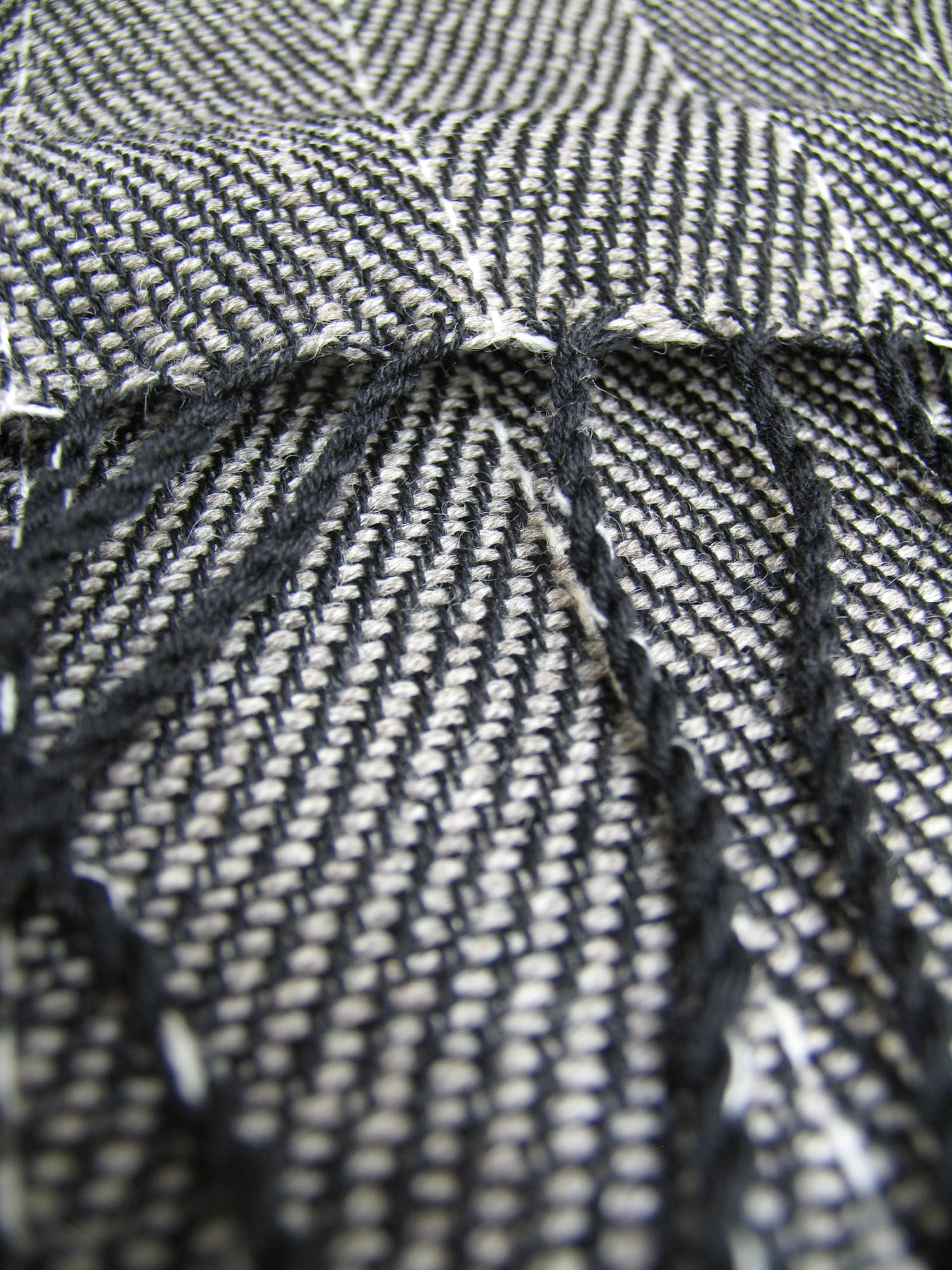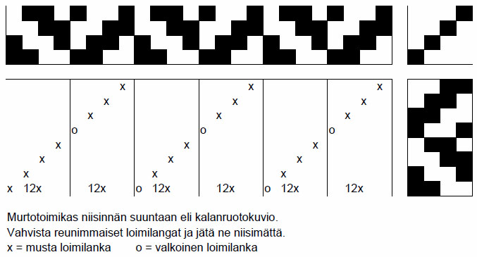 Kuudeskin huivi toteutui murtotoimikkaana ns. kalanruotokuviona. Vaihdoin niisintäryhmän vaihtokohtaan valkoiset loimilangat (5 kpl).