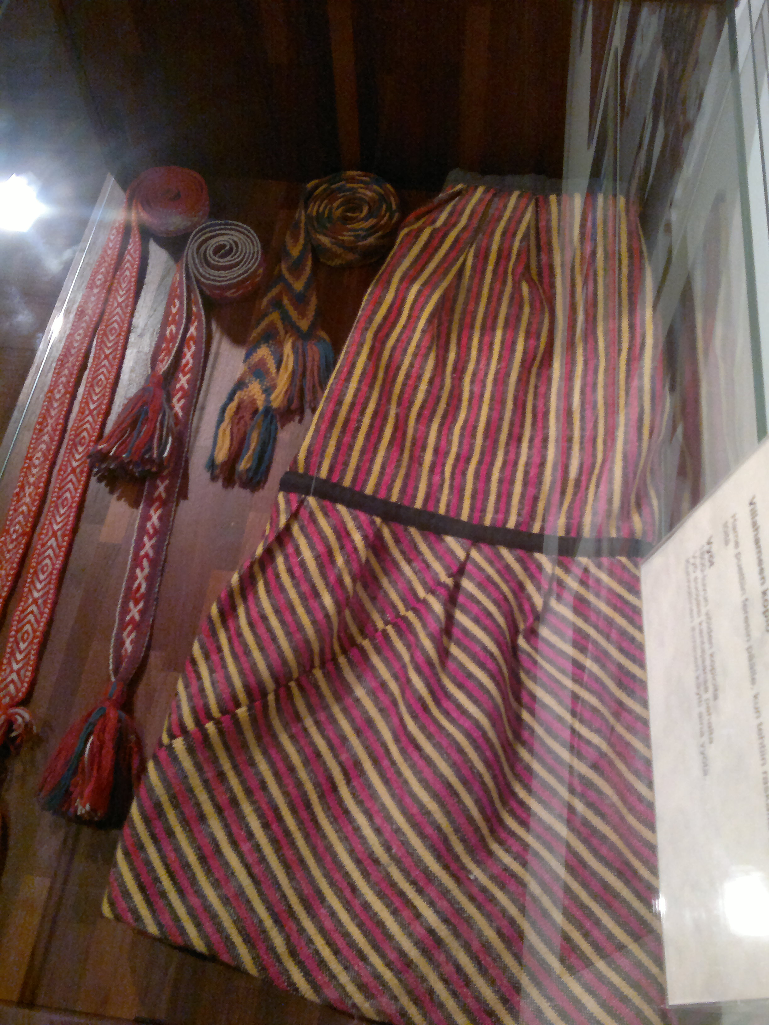 ”Kunnollinen ihminen käytti aina vyötä” kertoi esittelytaulu vitriinissä. Siinä esiteltiin 1800-luvun vöiden kopioita ja villahametta, joka puettiin feresin päälle raskaisiin tai likaisiin töihin.