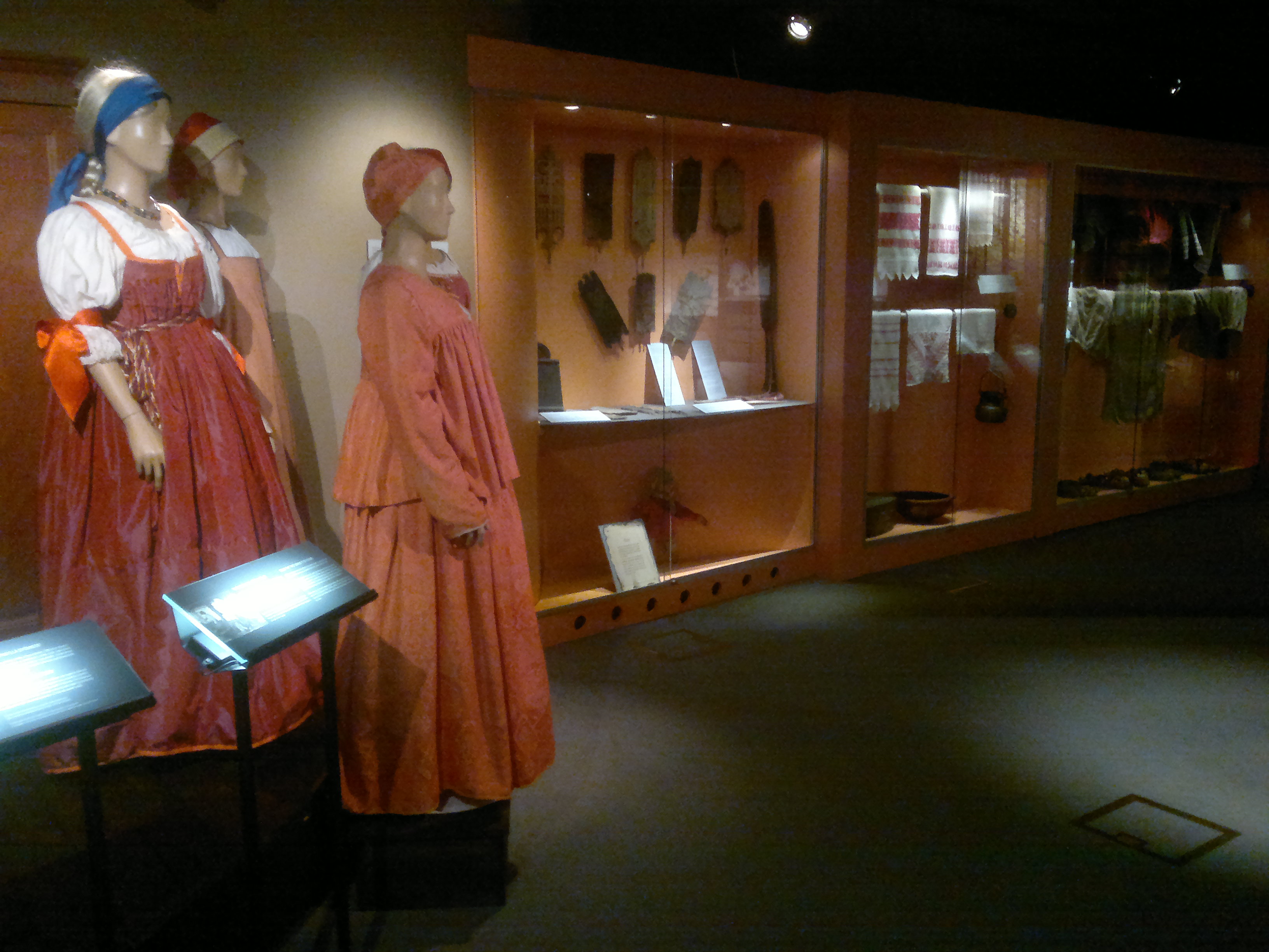 Carelicumin toisessa kerroksessa sijaitseva perusnäyttely oli laajentunut ja muuttunut – viimeksi olin sen nähnyt toistakymmentä vuotta sitten. Vaatetusta ja käsitöitä oli tarjolla sielläkin.