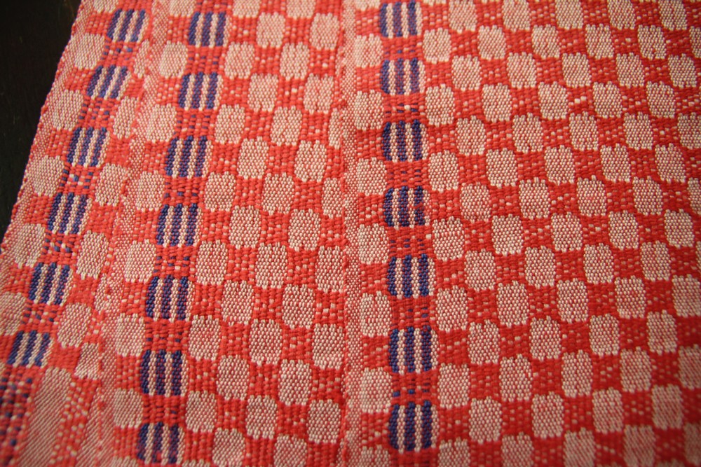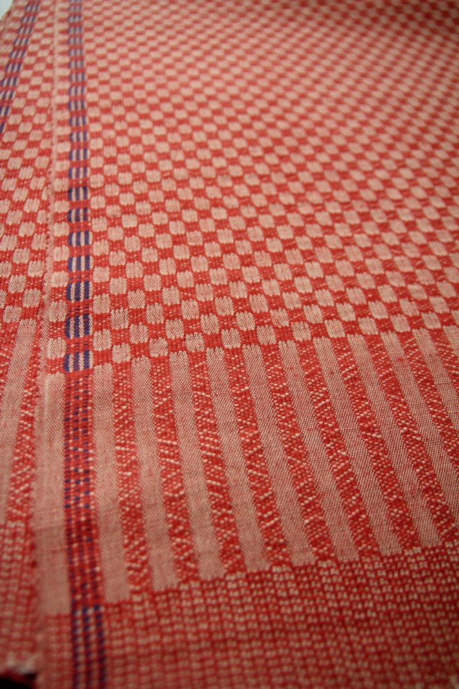 En pitänyt tarkkaa kirjaa kuteen menekistä, sillä asiakas oli antanut kaikki aivinansa näiden pyyhkeiden vapaaseen käyttöön. Kuitenkin näytti siltä, etteivät asiakkaan valkaisemattomat aivinat riittäisi kuin yhteen pyyhkeeseen kahden pyyhkeen sijasta. Teimme uuden suunnitelman: sovin hänen kanssaan, että kudon kolme pyyhettä valkaistulla ja kolme punaisella aivinalla.
