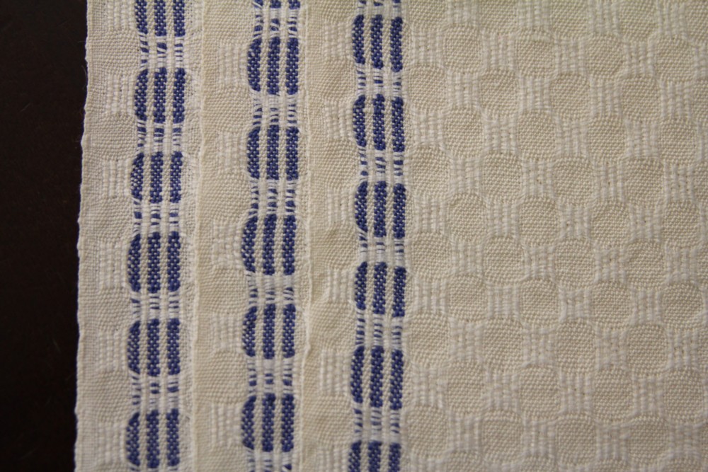 Näytetilkkuihin olin käyttänyt loimena sekä merseroimatonta (tex 36 x 2) että merseroitua puuvillaa (tex 30 x 2) ja loimen tiheys oli ollut 16. Kerroin asiakkaalle, että merseroitu puuvilla imee merseroinnin emäskäsittelyn vuoksi paremmin kosteutta. Se on myös lujempaa ja kiiltävämpää. (Lue John Merceristä, merseroinnin keksijästä.)