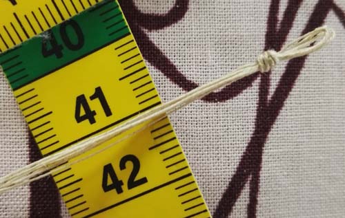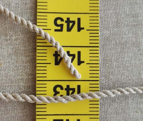 Kierretyn nyörin kutistumiseen on varattava pituutta reilusti (tässä esimerkissäni 2,5-kertaisesti). Kutistumiseen vaikuttavat käytetty lanka ja nyöriin tehty kierteisyys.