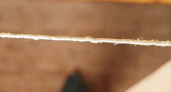 Käytän tähän nyöriin kaksisäikeistä valkaisematonta pellavalankaa, joka vastaa vahvuudeltaan suunnilleen Bockens 50/2 -nypläyslankaa.