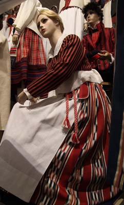 Hankasalmen naisen kansallispuvun kupeelta. Kuva Suomalainen kansallispuku -näyttelystä Suomen käsityön museolta 10/2017.