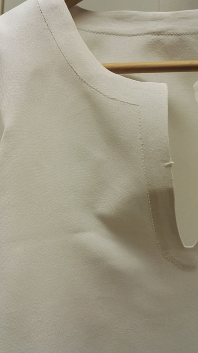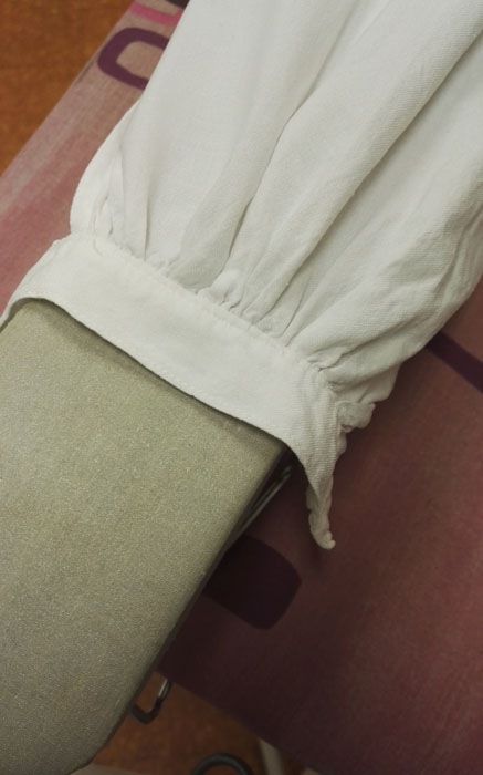 Kaukolan naisen tarkistamattoman kansallispuvun paita oli ”kutistunut”, joten sain sen asiakkaaltani suurennettavaksi. Kovin paljoa paitaa ei voi suurentaa, jotta mittasuhteet eivät muutu oudoiksi, mutta tämän verran juuri ja juuri pystyy.