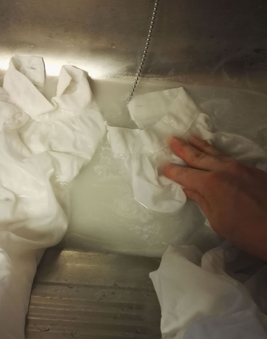Ompelutyön jälkeen keittovalkaisin paidan kattilassa, jotta uusi ja kellastunut vanha kangas ovat saman väriset. Huuhteluiden jälkeen tärkkäsin paidan, annoin sen kuivahtaa ja silitin kuivaksi.