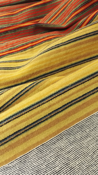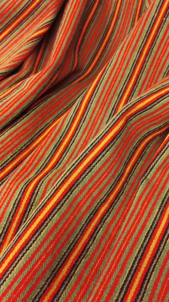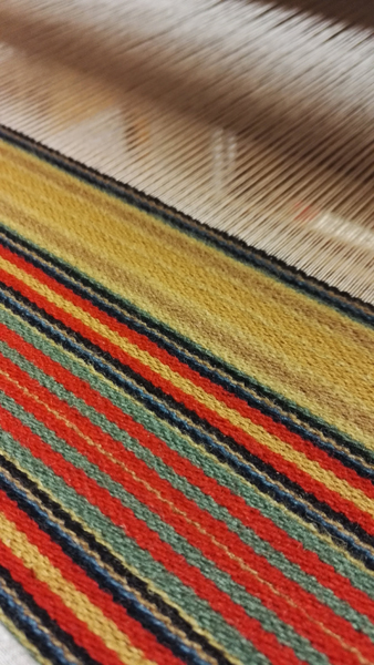 Tämän hamekankaan pituus (eli toisin sanoen hameen helman ympärysmitta) oli asiakkaan toiveesta n. 3,5 metriä. Kudoin aluksi puna-vihreän osuuden, sitten jäljelle jääneistä langoista etuosan kellansävyisen osan ja lopuksi vyötärökaitaleen.