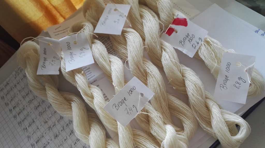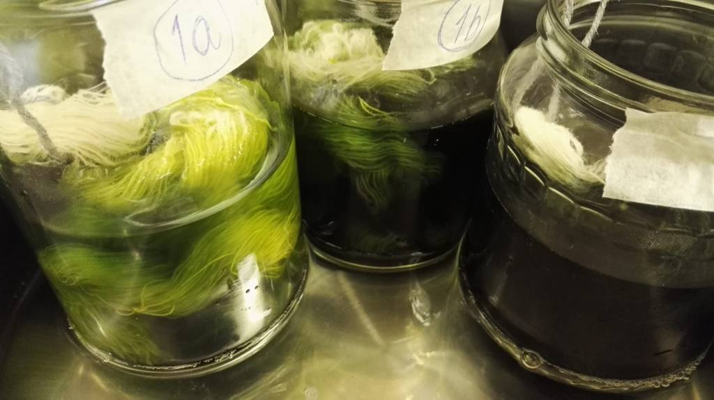 Yhden värjäyksen tekeminen vie aikaa valmisteluista kuivan langan sävyn tutkimiseen n. kolme tuntia. Toistin samoilla resepteillä värjäyksiä useita kertoja, millä testasin antaako resepti saman värjäystuloksen värjäyserästä toiseen. Kehitin kolmisenkymmentä reseptiä valmiiksi.